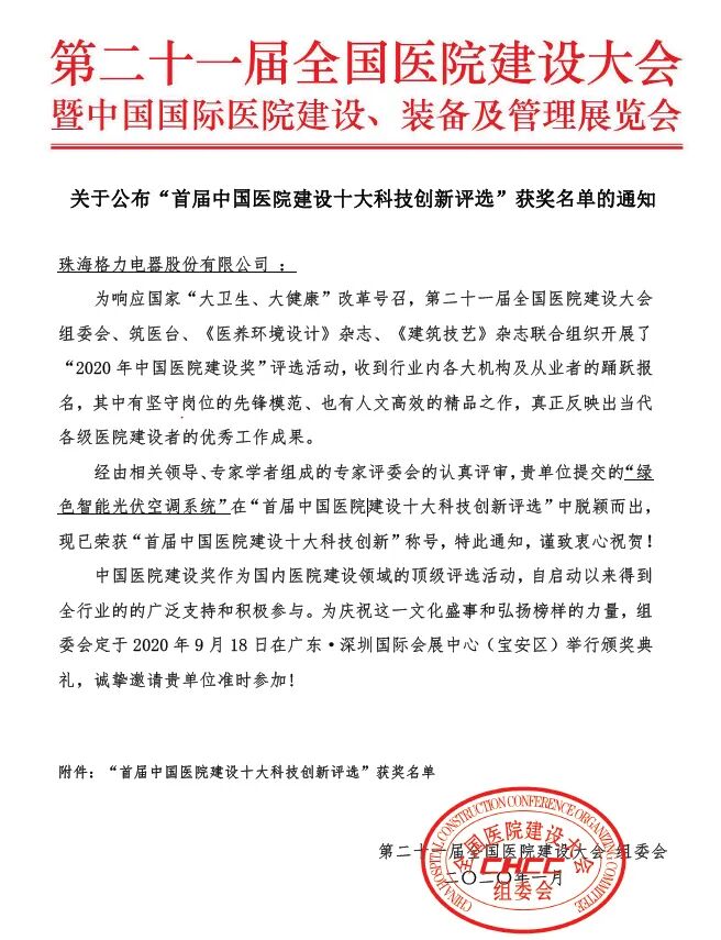 格力电器获“首届中国医院建设十大科技创新”奖 为响应国家“大卫生、大健康”改革号召,由第二十一届全国医院建设大会组委会、筑医台、《医养环境设计》杂志、《建筑技艺》杂志联合主办的“2020年中国医院建设奖”评选活动于2019年4月12日正式启动。 在众多参选方案中,格力电器凭借的“绿色智能光伏空调系统”脱颖而出,荣获“首届中国医院建设十大科技创新”奖。 ![]() 首届中国医院建设十大科技创新 “首届中国医院建设十大科技创新”奖由相关领导、专家学者组成的医院专家评委会的认真评审,正式公布的奖项。该奖项致力于真正解决医院建设行业实践难点与痛点,激励医院建设领域创新技术产品的发展。